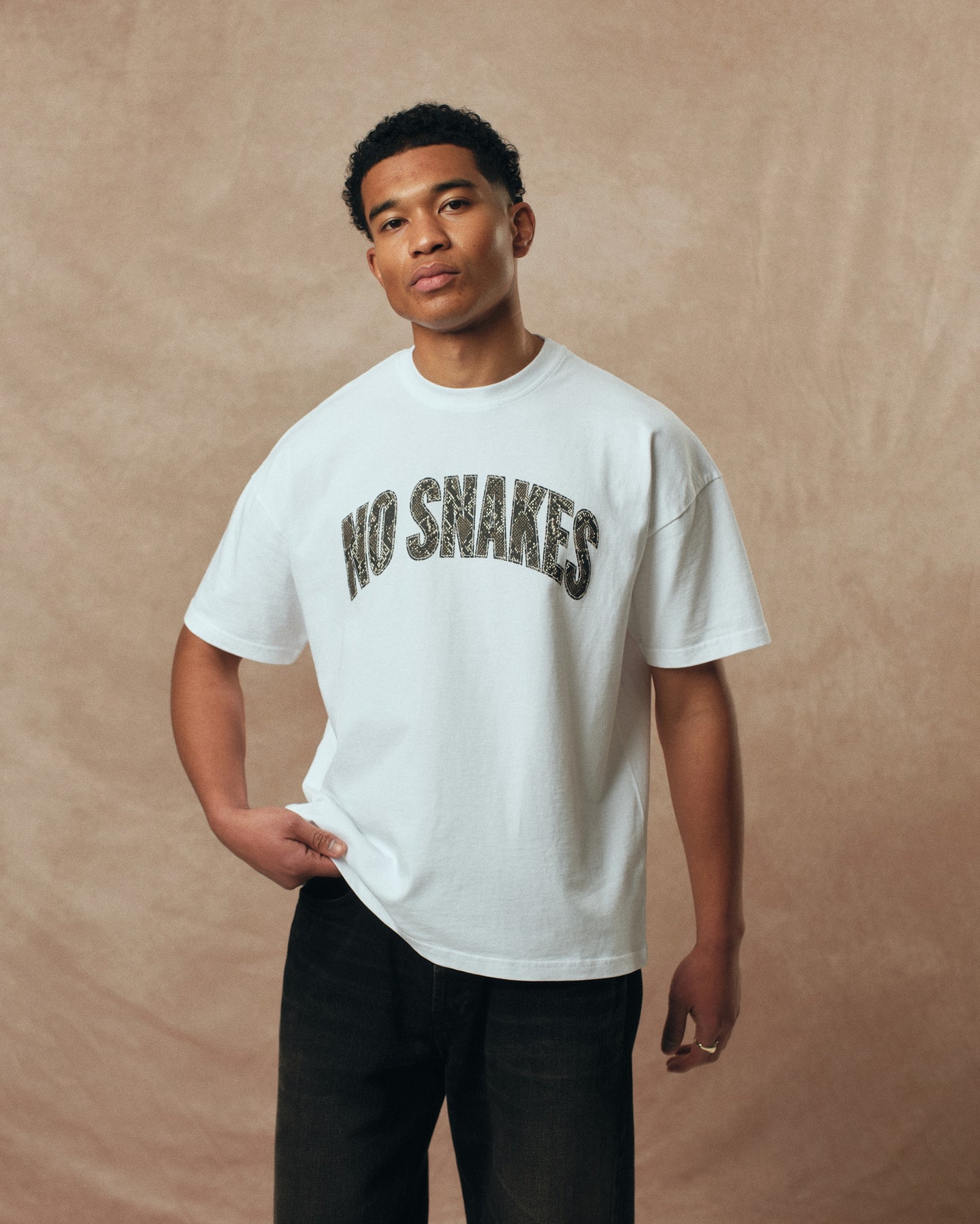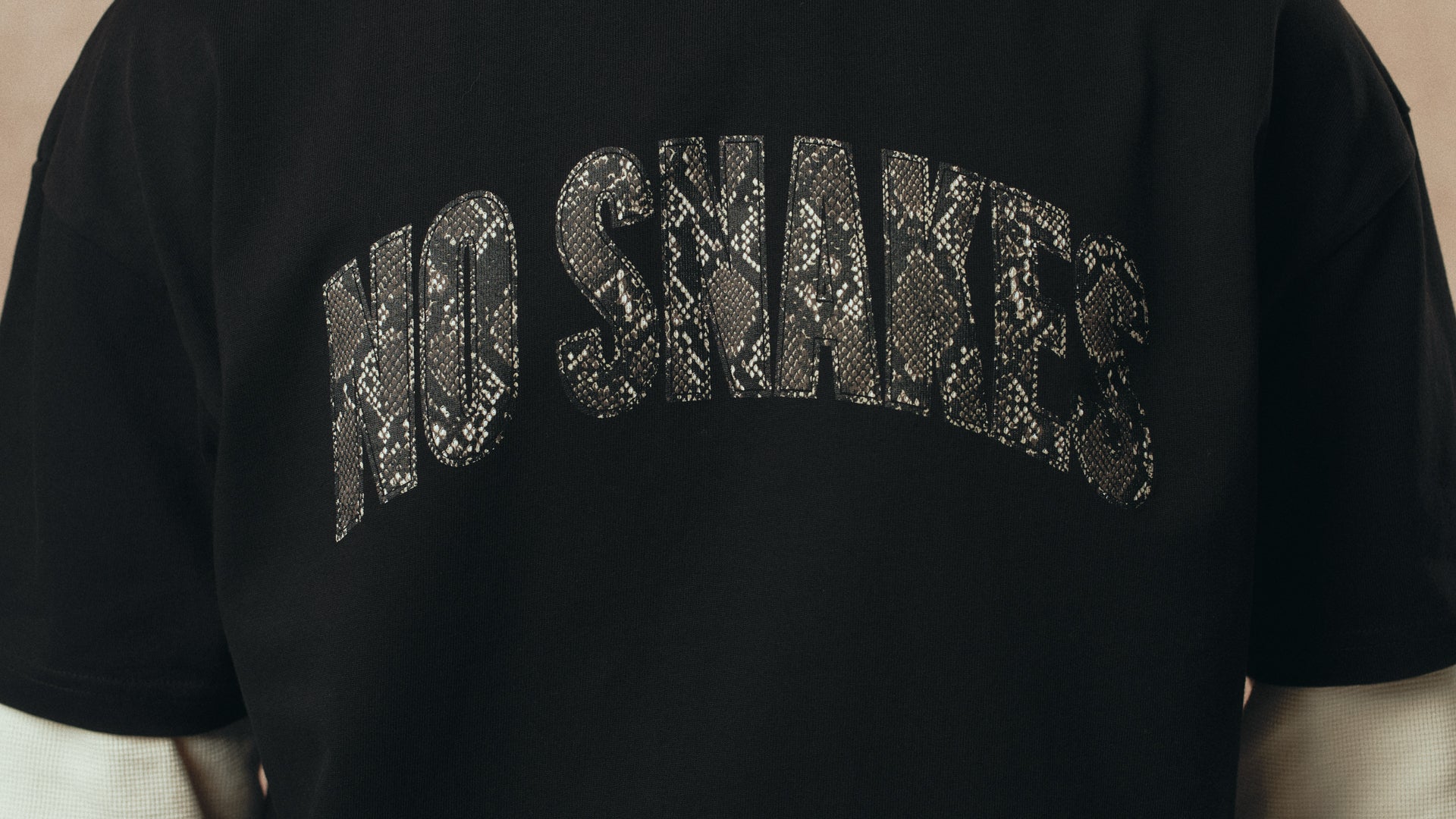 The No Snakes snakeskin pattern has been built from scratch, and refined over & over. These pieces bridge the gap between our larger graphic-led releases and the cleaner No Snakes logos of old. They’ve been worn non-stop here since the first samples arrived, and given us plenty more ideas for developing snakeskin further.