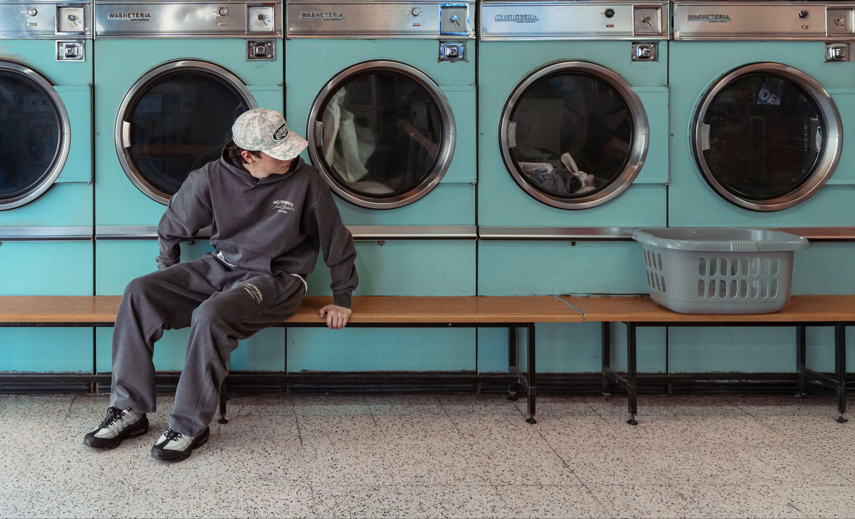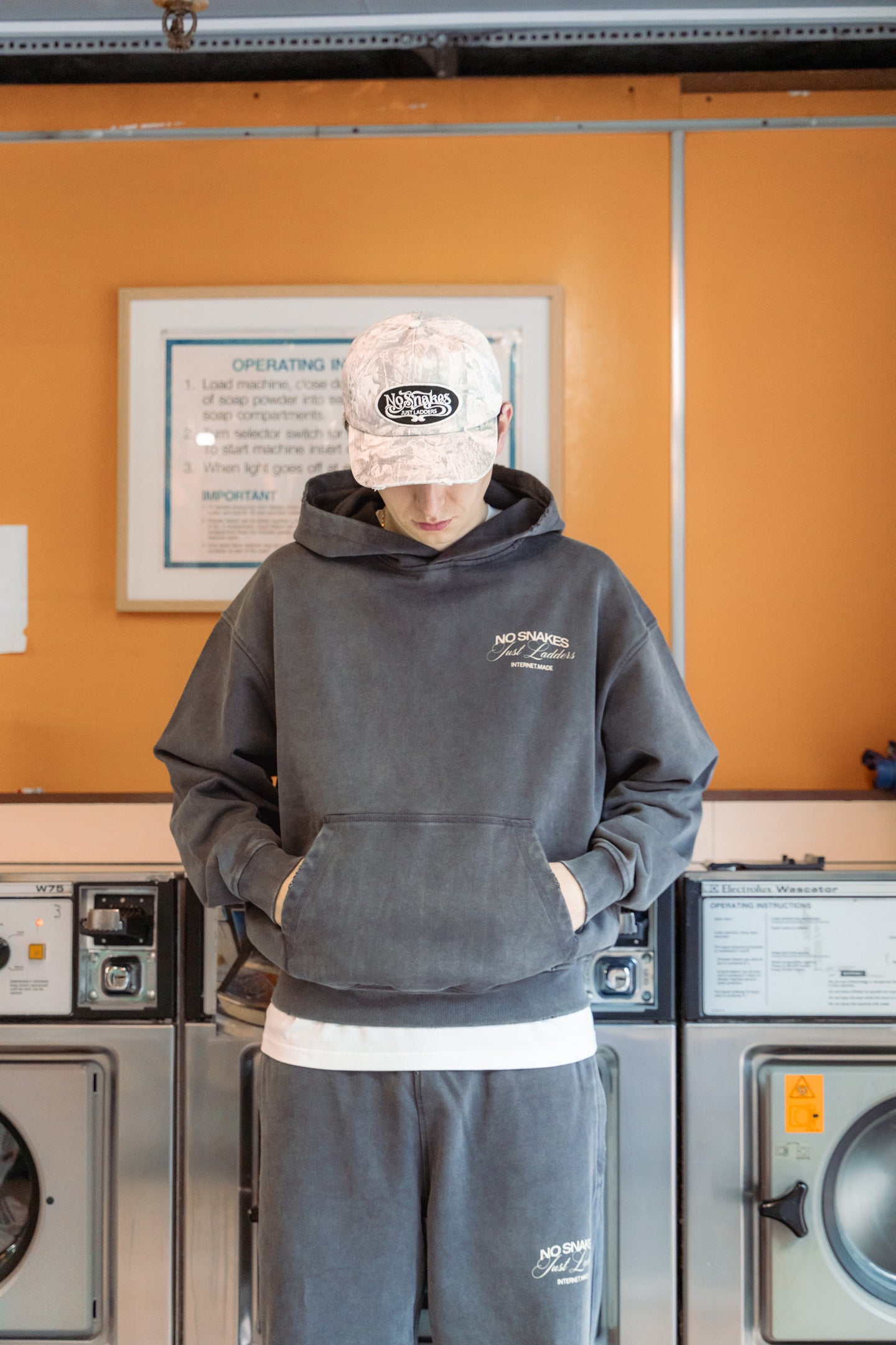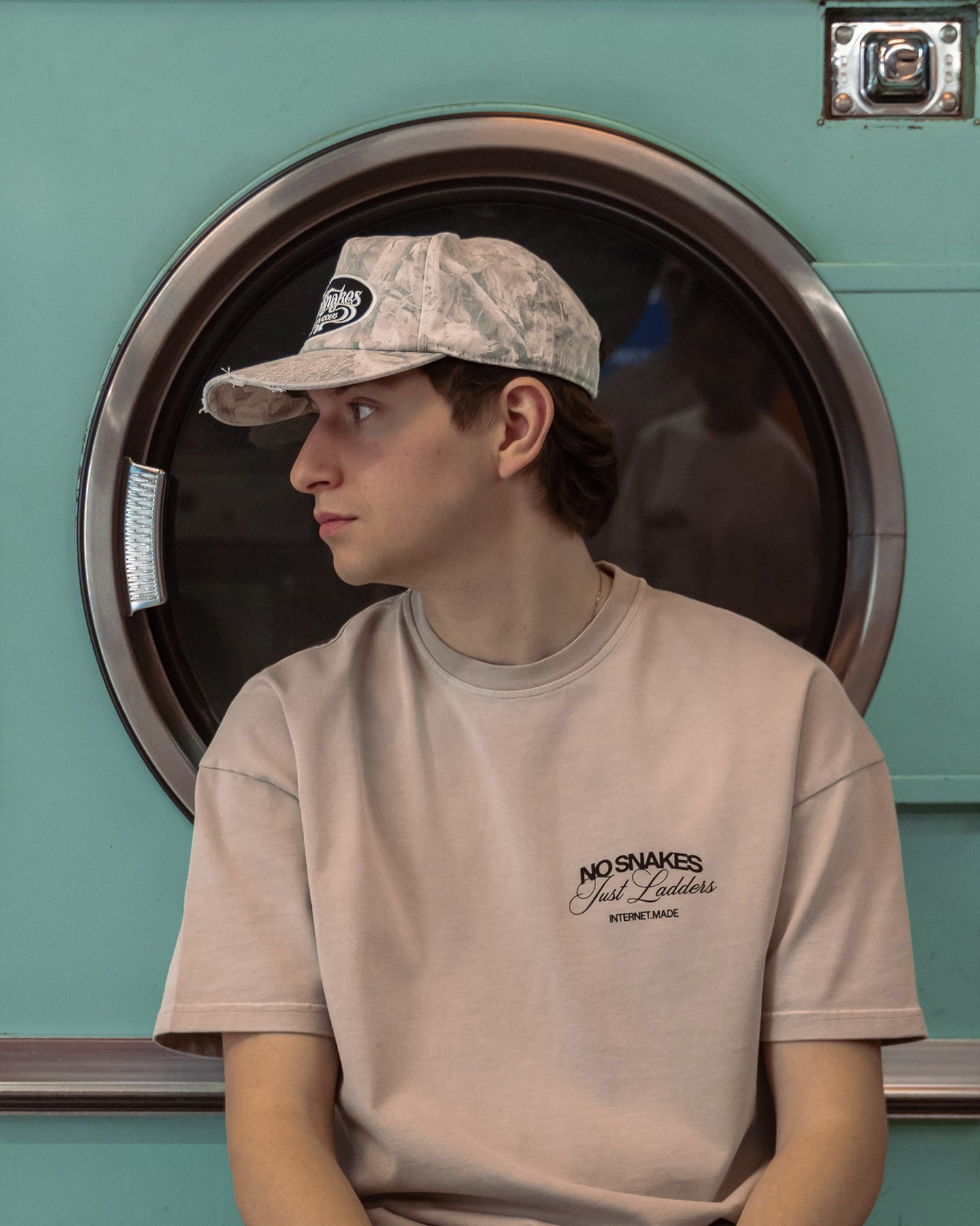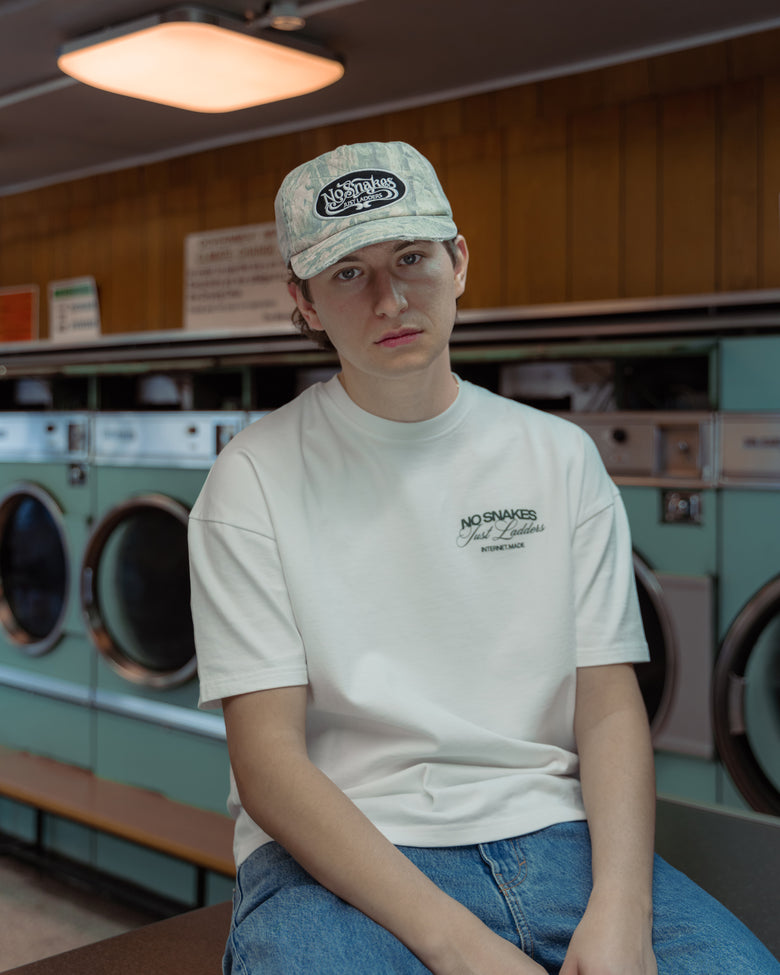 Rounding out the drop is a new No Snakes cap, an easy-to-wear 5-panel design with a blend of baseball and trucker shapes. A new NSJL logo is set against a custom Internet Made camouflage pattern, subtly incorporating our rings logo and finished with a washed treatment and light distressing across the visor.